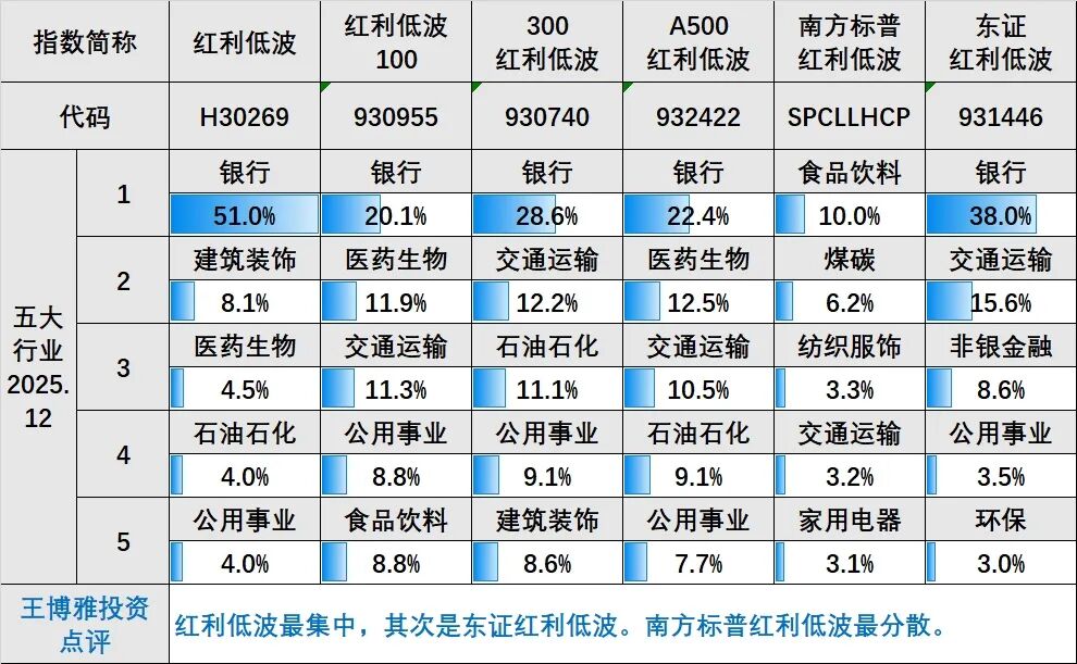 其他四个红利低波指数都有行业限制,因此行业分布会更加分散,后面我们再具体讨论。