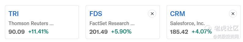 股价反应非常直接。汤森路透(TRI)单日上涨11.4%,创下2008年以来最大单日涨幅;FactSet(FDS)上涨近6%;Salesforce(CRM)反弹超过4%。