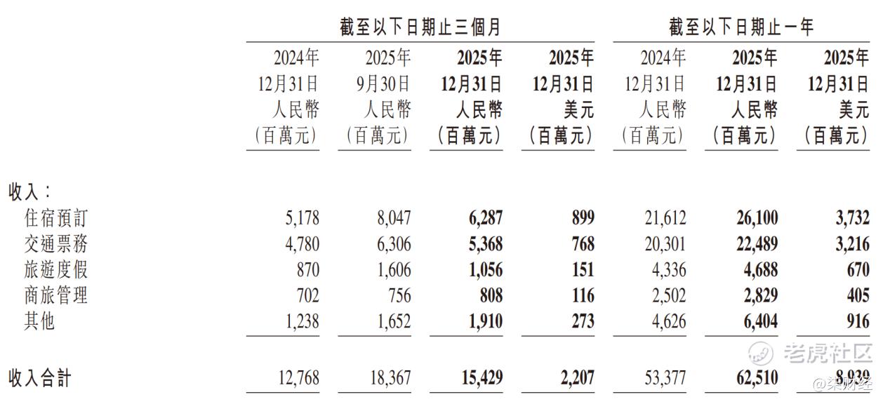 划分业务板块,住宿预定收入261亿元、交通票务收入224.89亿元、旅游度假收入46.88亿元、商旅管理收入28.29亿元,其他收入64.04亿元,相较2024年,全部上行加速,增速分别为20.77%、10.78%、8.12%、13.07%、38.43%。