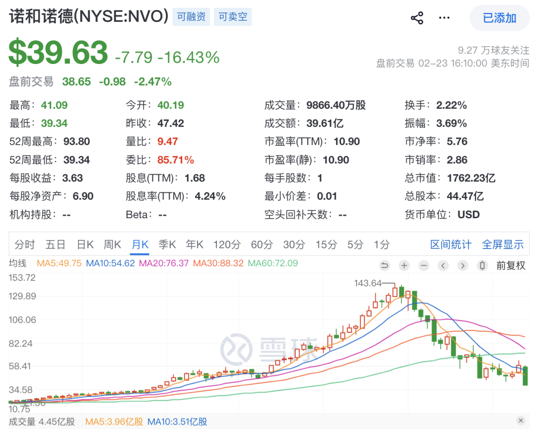 凌晨美股收盘,减肥药巨头诺和诺德暴跌16.43%,收于39.63美元/股,创下了2021年6月以来的最低水平。