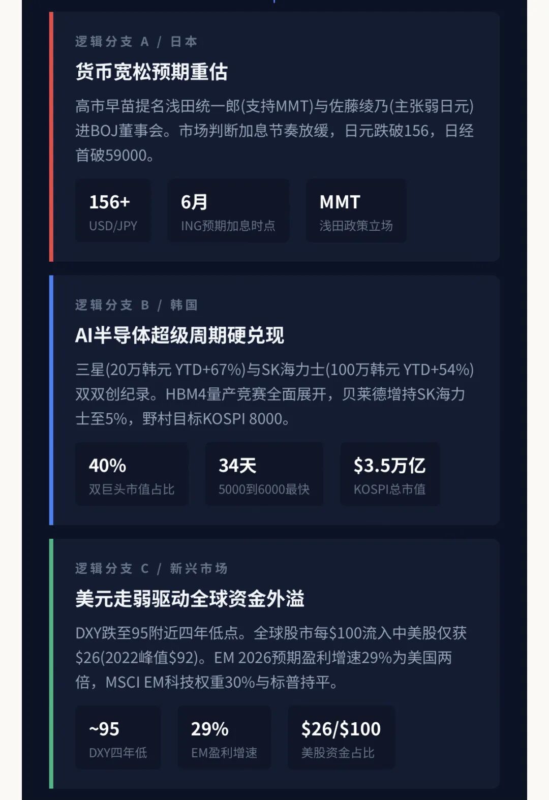 韩国的逻辑完全不同——三星电子突破20万韩元、SK海力士站上100万韩元,两家公司合计占KOSPI市值40%,背后是HBM4量产叠加英伟达Q4财报确认AI需求"exponentially growing"的超级周期故事。