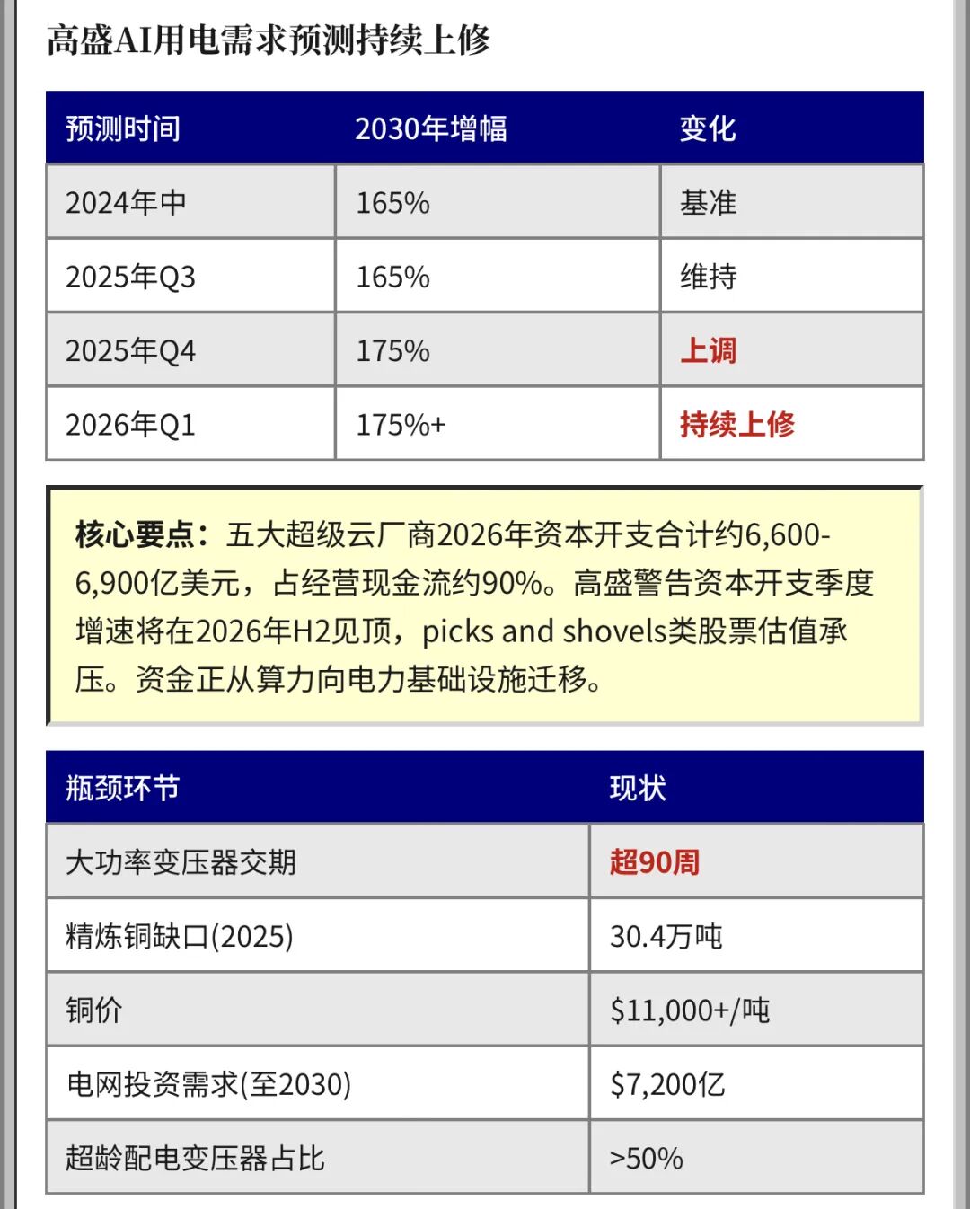 真正值得注意的是,高盛估算全球电网到2030年需要约七千二百亿美元的升级投资,但大功率变压器交货周期已从疫情前的40周飙升至超过90周。数据中心开发商过去抢GPU,现在抢变压器和开关柜。