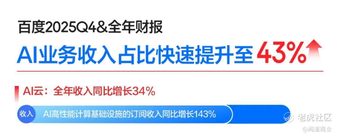 2025年,百度实现总营收1291亿元,其中AI业务营收达到400亿元。特别是第四季度,不断提速的AI业务收入占到了一般性业务收入的43%。 $百度集团-SW(09888)$