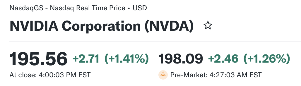 财报发布后英伟达盘后股价报198.09美元,较收盘价195.56美元上涨约1.26%。此前盘中收盘已涨1.41%,意味着市场对财报有所预期,部分利好已提前消化。