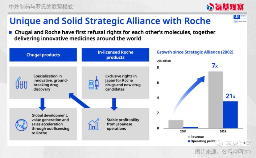 据其披露,自与罗氏达成联盟后,中外制药的营收增长了7倍(2002年至2024年),营业利润增长了21倍。这也解释了中外制药的股价涨幅,远超其他日本药企。