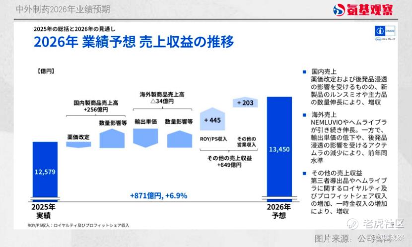在2025年年报电话会上,中外制药释放出积极信号,如下图所示,得益于特许权使用费等其他销售收入的增长,预计2026年销售额和利润将再创历史新高,营收有望达13450亿日元,营业利润率将维持在49.8%的高水平,而这一预测还是基于保守预期的结果。