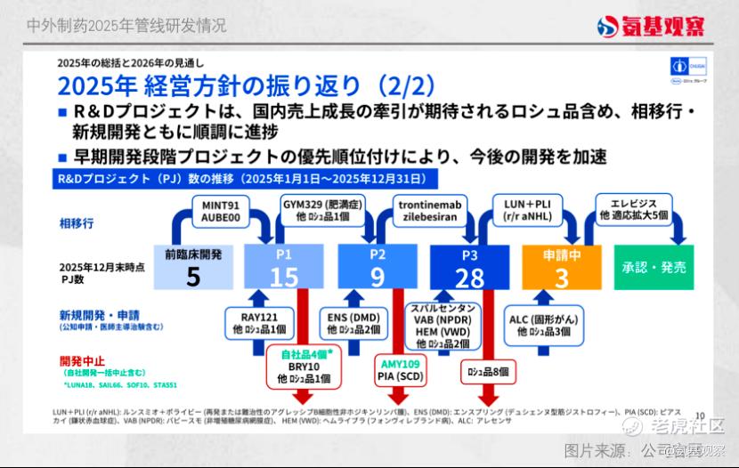 中外制药保留管线研发的独立决策权,避免了大公司并购后的创新僵化;罗氏日本分公司与中外制药合并,研发团队共享数据和全球研发进度。正是这种独立性,让中外制药得以充分发挥自身专长,从罗氏的“代理商”转型为“创新引擎”。截至2025年底,中外制药已有3 个产品处于上市申请阶段,3期管线28个、2期管线9个、1期管线15个。
