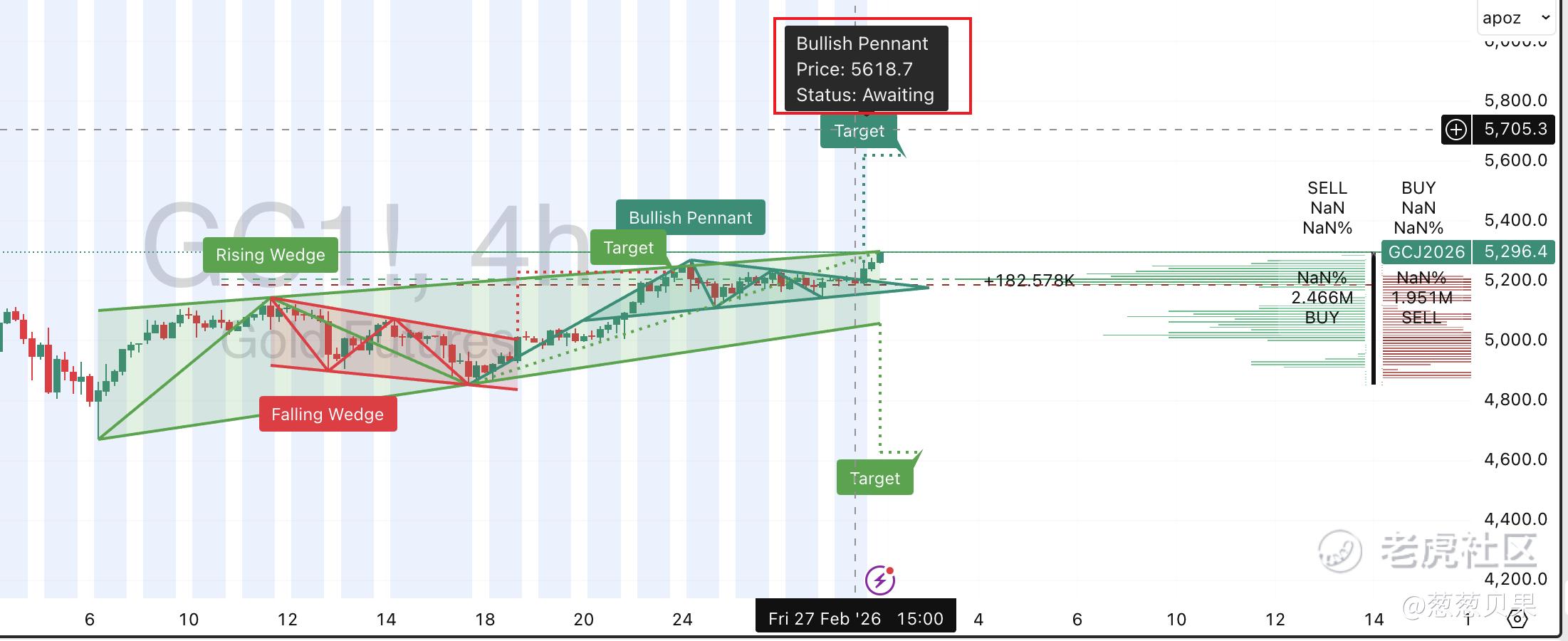 国际金价最近走出了一个bullish旗型,向上目标位是5618美元。但也有一个看跌的rising锲型,向下目标位是4628美元。你觉得哪个形态会反应真是未来价格?