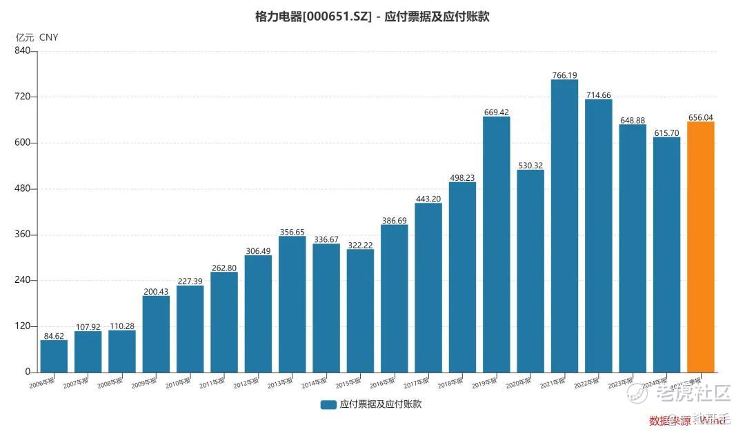 从绝对值来看,2021年以来,格力电器的应付账款基本维持在600亿元以上,2025年第三季度更是达到了656.04亿元,不是个小数目。