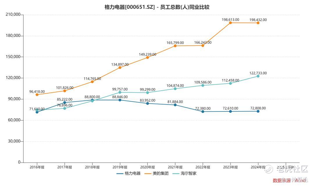 据Wind数据显示,格力的员工人数在2018年达到顶峰,有8.88万人,跟美的集团、海尔智家处于同一梯队;可时至今日,格力的员工缩减至7.28万人