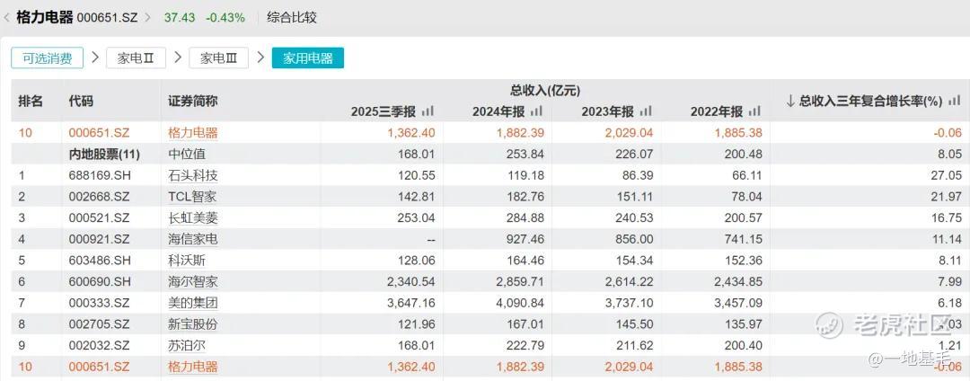 美的集团今年前三季度总收入达到3647.16亿元,营业收入接近格力的三倍,近3年总收入复合增长率为6.18%。海尔智家营业收入接近格力的两倍,近3年总收入复合增长率为7.99%。