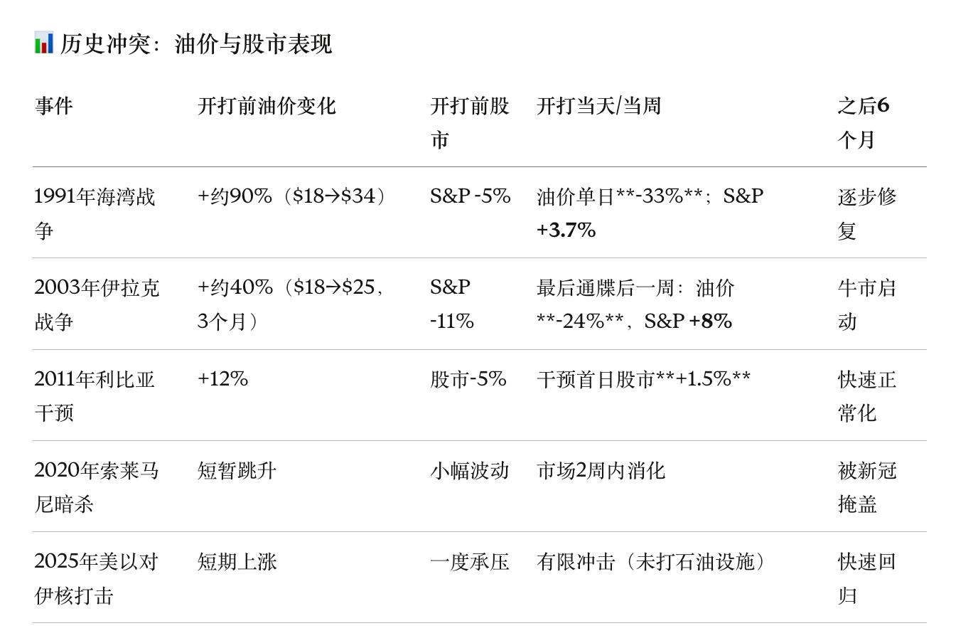 这是规律,不是巧合。华尔街有一句话:"Sell the sabre-rattling, buy the bullets." 威胁阶段,市场最悲观;真正开打,不确定性消除,市场反而倾向于反弹。