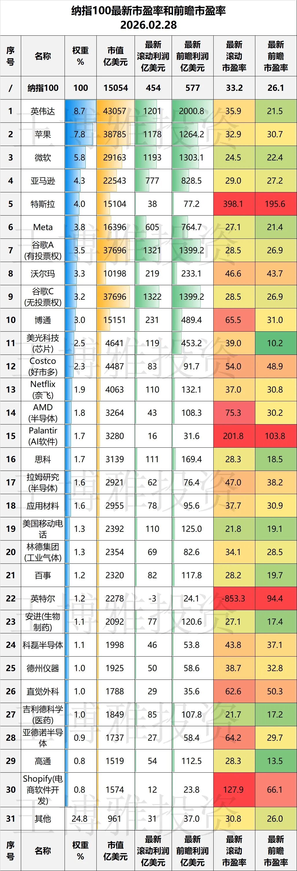 纳指100及其主要成分股最新最准滚动市盈率及未来一年前瞻市盈率(2026.02.28)