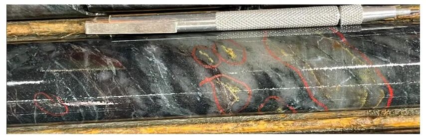 图2. 钻孔MM26D-13-4773-002在93米钻孔深度处显示的可见金。