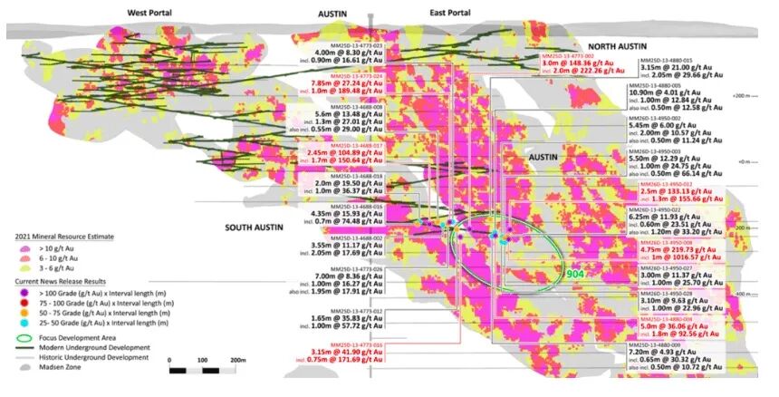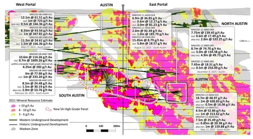 最近在下Austin区904 Complex钻探的成功,显示了在主Austin矿化带发现与2025年钻探活动中已在South Austin带圈定的高品位金矿化透镜体非常相似的其他高品位透镜体的潜力(参见South Austin区2025年8月12日、2025年5月27日和2025年2月26日的新闻稿)。预计下Austin区域在2026年剩余时间内将继续成为Madsen矿钻探的主要焦点。