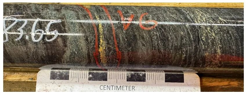 图1. 钻孔MM26D-13-4950-008在83.65米钻孔深度处显示的可见金。