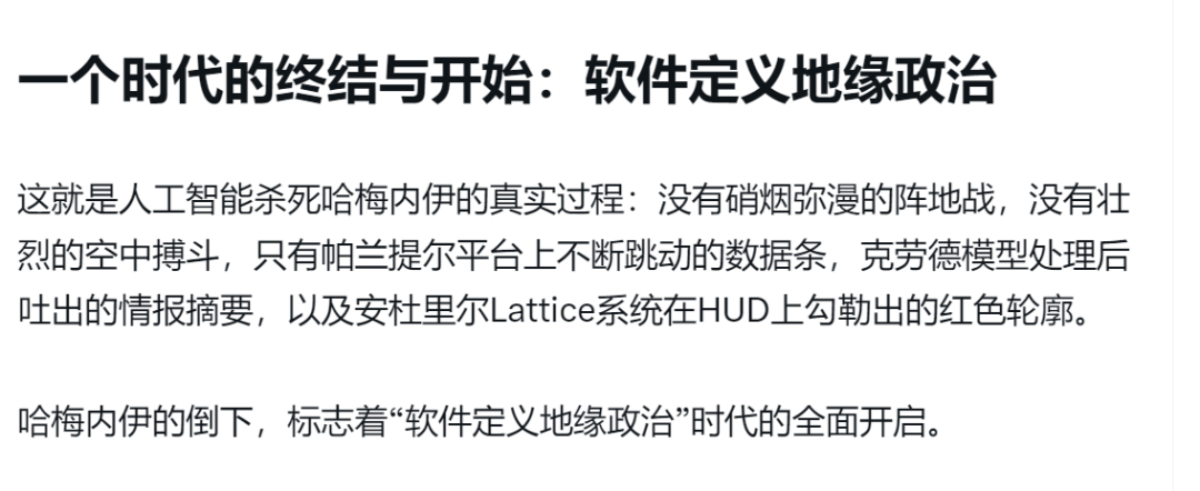 首先技术突破,是最最最重要的因素之一。不单纯是强人意志问题,实际上在这个位置上都挺强的,以往的代价过高,而在这一次的作战当中,包括帕兰蒂尔的数据分析、星链,以及空天一系列的科技突破,让战场调动速度变得前所未有的快,精准,高效低成本。