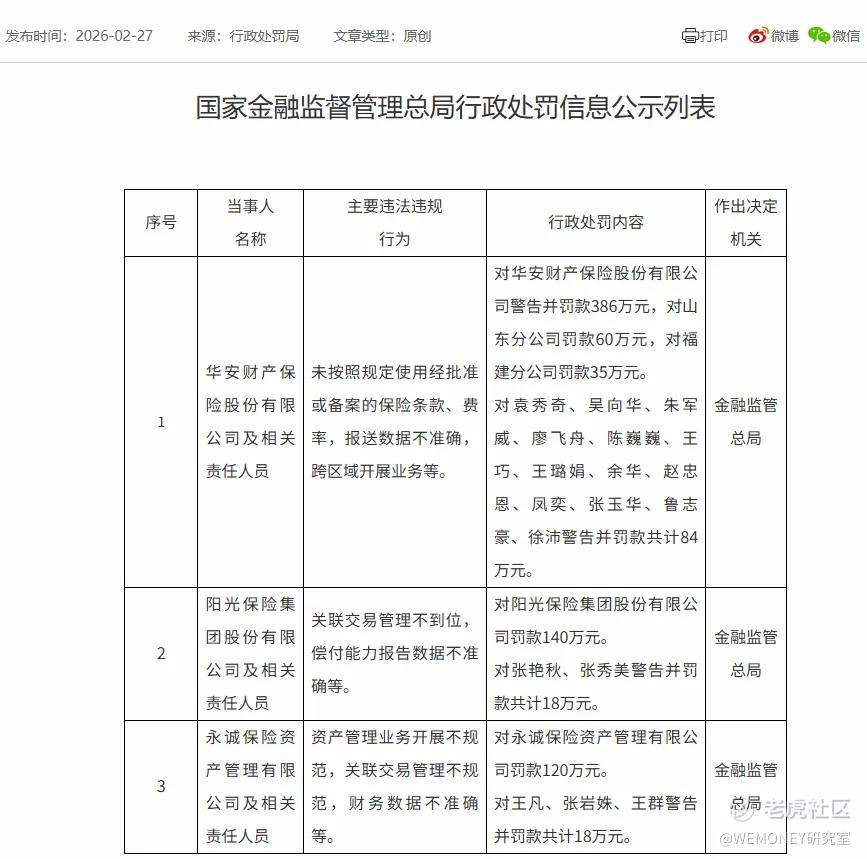根据国家金融监督管理总局2026年2月27日披露的行政处罚信息,阳光保险集团股份有限公司及相关责任人存在两项核心违规事实:一是关联交易管理不到位,二是偿付能力报告数据不准确。针对上述违规行为,监管部门对阳光保险集团股份有限公司处以140万元罚款;对责任人张艳秋、张秀美分别给予警告,二人合计被罚款18万元。