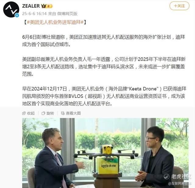 2025年6月6日,彭博社报道称,美团正加速推进其无人机配送服务的海外扩张计划,迪拜成为首个国际试点城市。