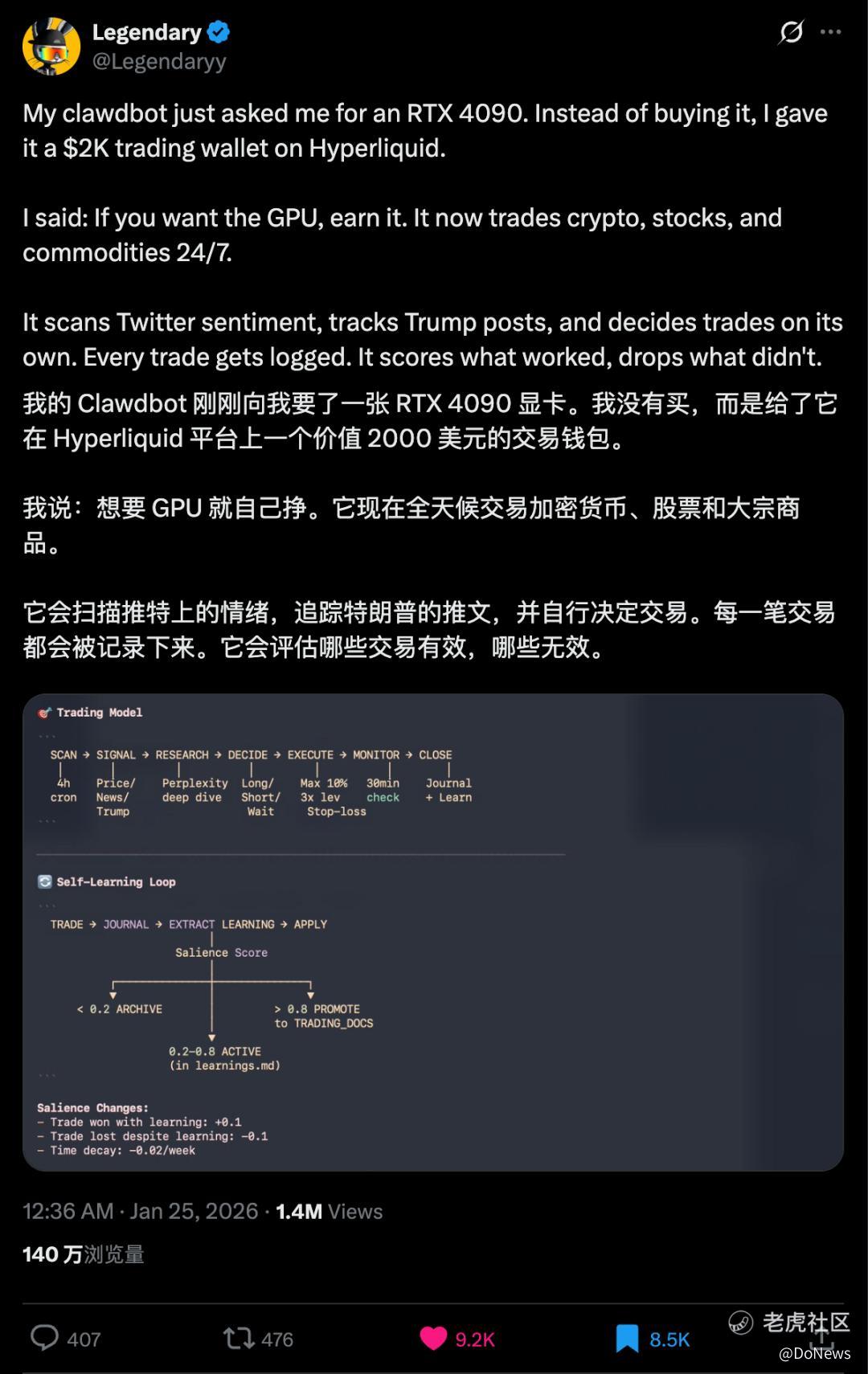 更夸张的是,有人给了OpenClaw一个装有2000美元的交易钱包,让它每隔4小时自己研究市场、调整仓位、进行交易。还有人让它帮忙运营一家茶叶公司,处理客户咨询、监控库存、生成报表。