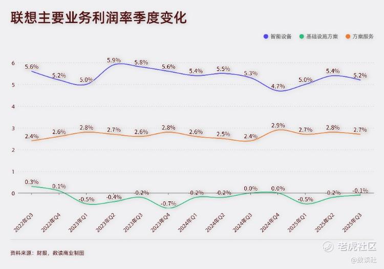 对于增长最快的基础设施方案业务基础设施方案业务,联想的思路也是提升利润。第三财季,联想基础设施方案业务启动战略性重组,砍掉部分非核心研发线、优化成本结构、调整产品组合。联想计划未来三年,每年净成本节省14亿元。