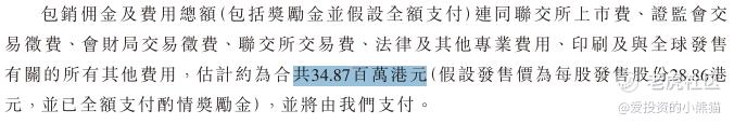 然后这个票招股书上按发售价28.86港元计算,公开的上市所有开支总额约为3487万港元,募资额约10.10亿港元,占比约3.45%,开支相比募资额算是比较少了。