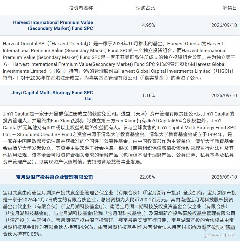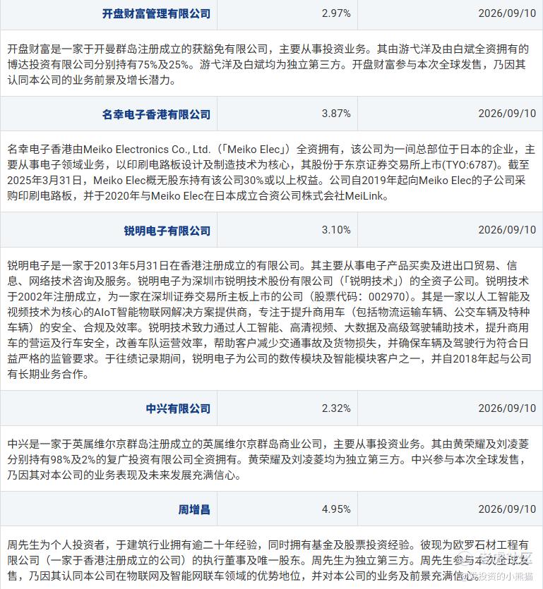 第二梯队为专业投资机构与个人投资者,其中Harvest International Premium Value (Secondary Market) Fund SPC与个人投资者周增昌认购占比相同,均为4.95%;开盘财富管理有限公司认购占比2.97%;Jinyi Capital Multi-Strategy Fund SPC Ltd.认购占比1.16%。专业投资机构的加入,为本次IPO提供了坚实的资金保障与市场信心。