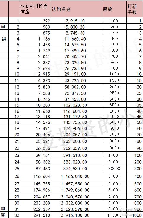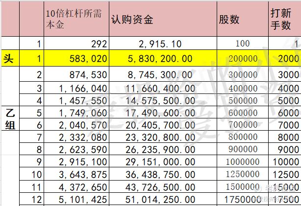 这个票甲尾292万,乙头需要认购资金584万,乙组的各档融资所需要的本金还有融资金额对应如下表: