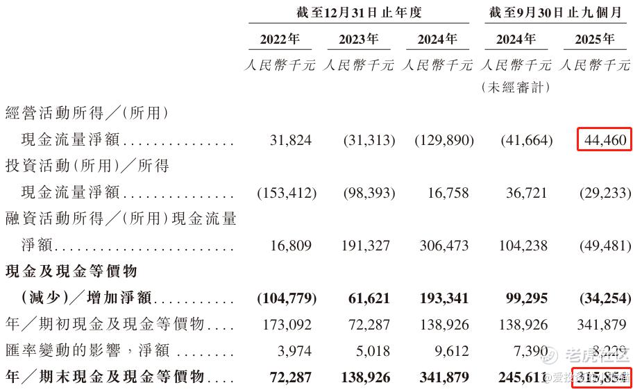 截至2025年9月30日,账上现金约人民币3.16亿元,经营现金流为0.44亿元。