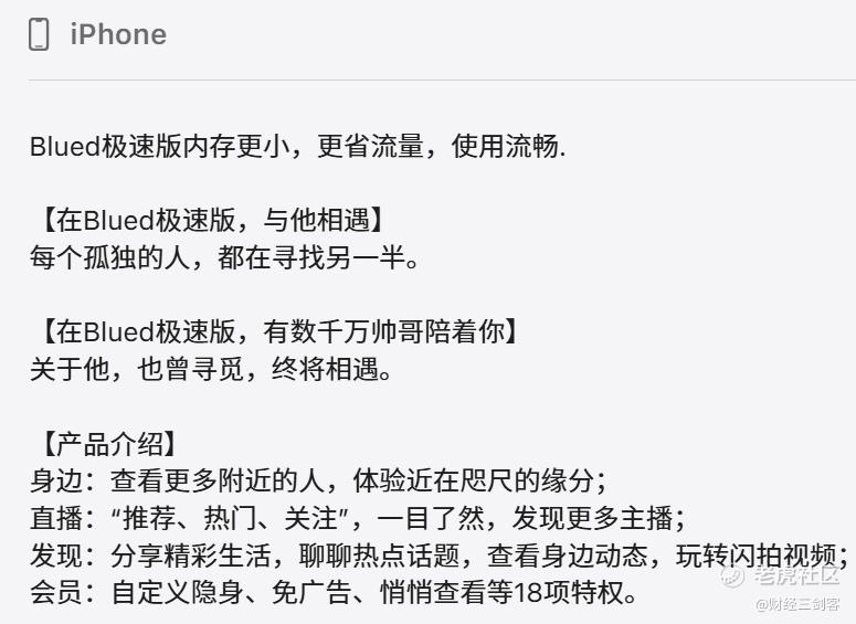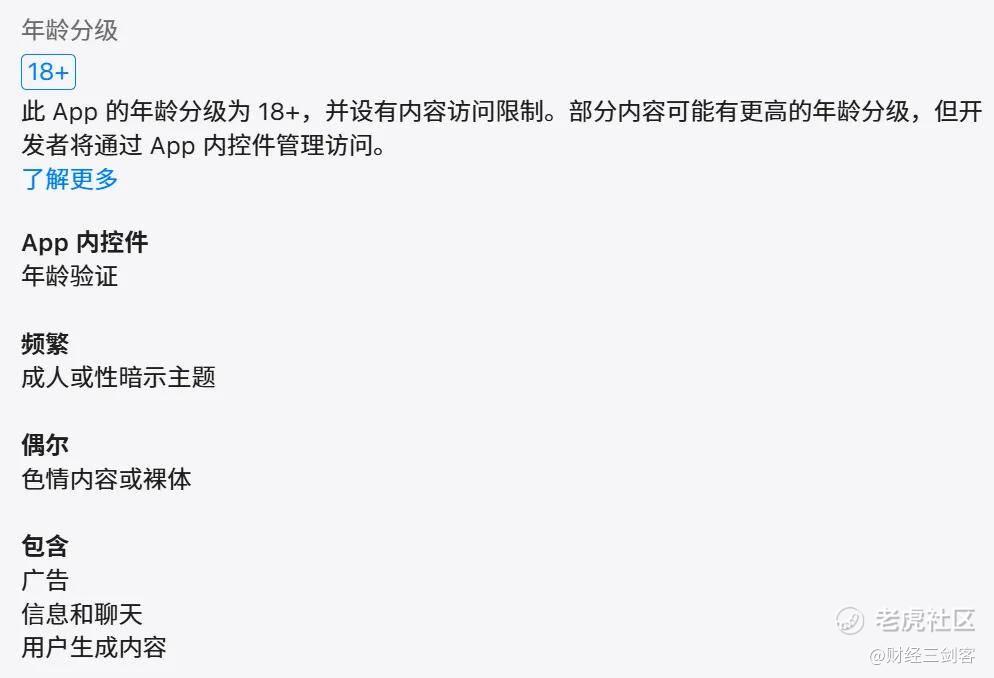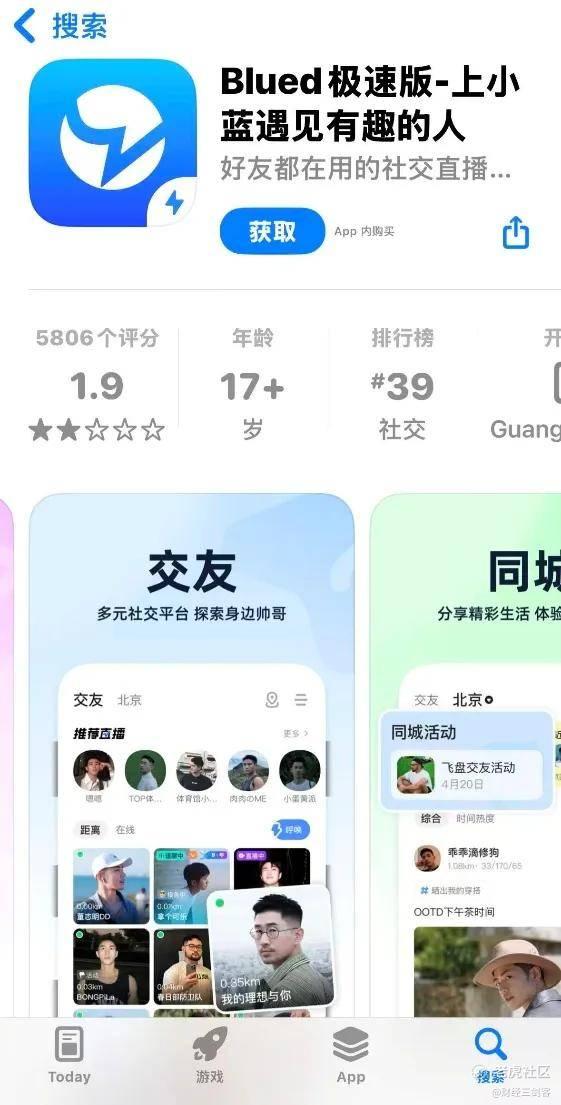 天眼查App显示,在苹果应用商店年龄分级中,Blued极速版被标注为“18+”,并指出成人或性暗示主题频繁,偶尔有色情内容或裸体。相比之下,主流泛社交App的分级宽松得多,微信为“4+”,新浪微博为“12+”,即便是专注婚恋的青藤之恋也仅为“17+”。这足以说明Blued极速版在内容性质上依然存在较大风险,所谓的“合规”不过是自欺欺人。
