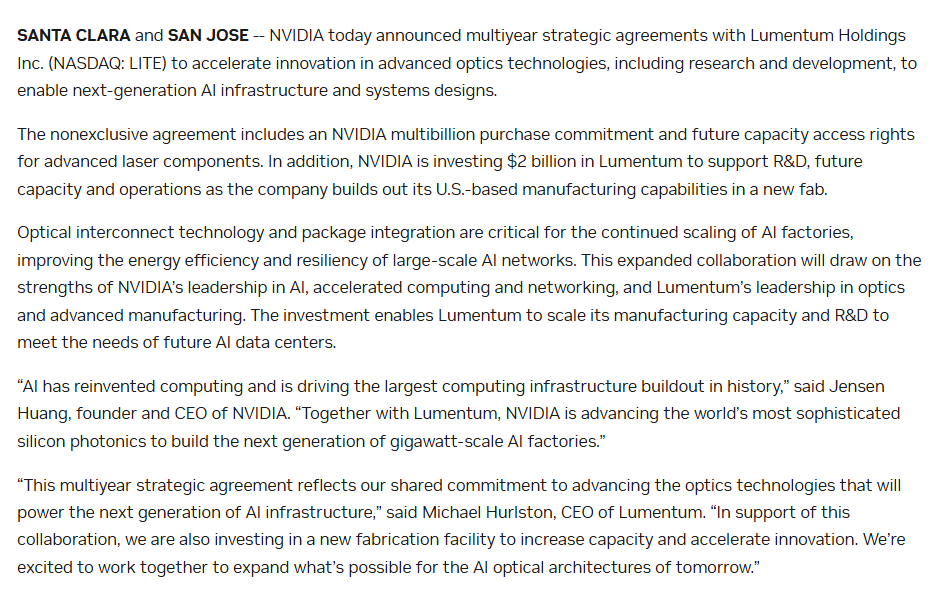 和Lumentum的协议,首先并非是排他协议,仅带优先权,包括:采购承诺、激光组件产能优先权、共同研发silicon photonics、扩大美国本土制造。黄仁勋曾经表达过一种观点:能源效率是我们的首要任务。那么随着GPU数量暴涨,过去传统铜线传输,能耗、效率、规模化都比不上硅光,或许这就是英伟达选择从铜到光的转向原因。[正经]
