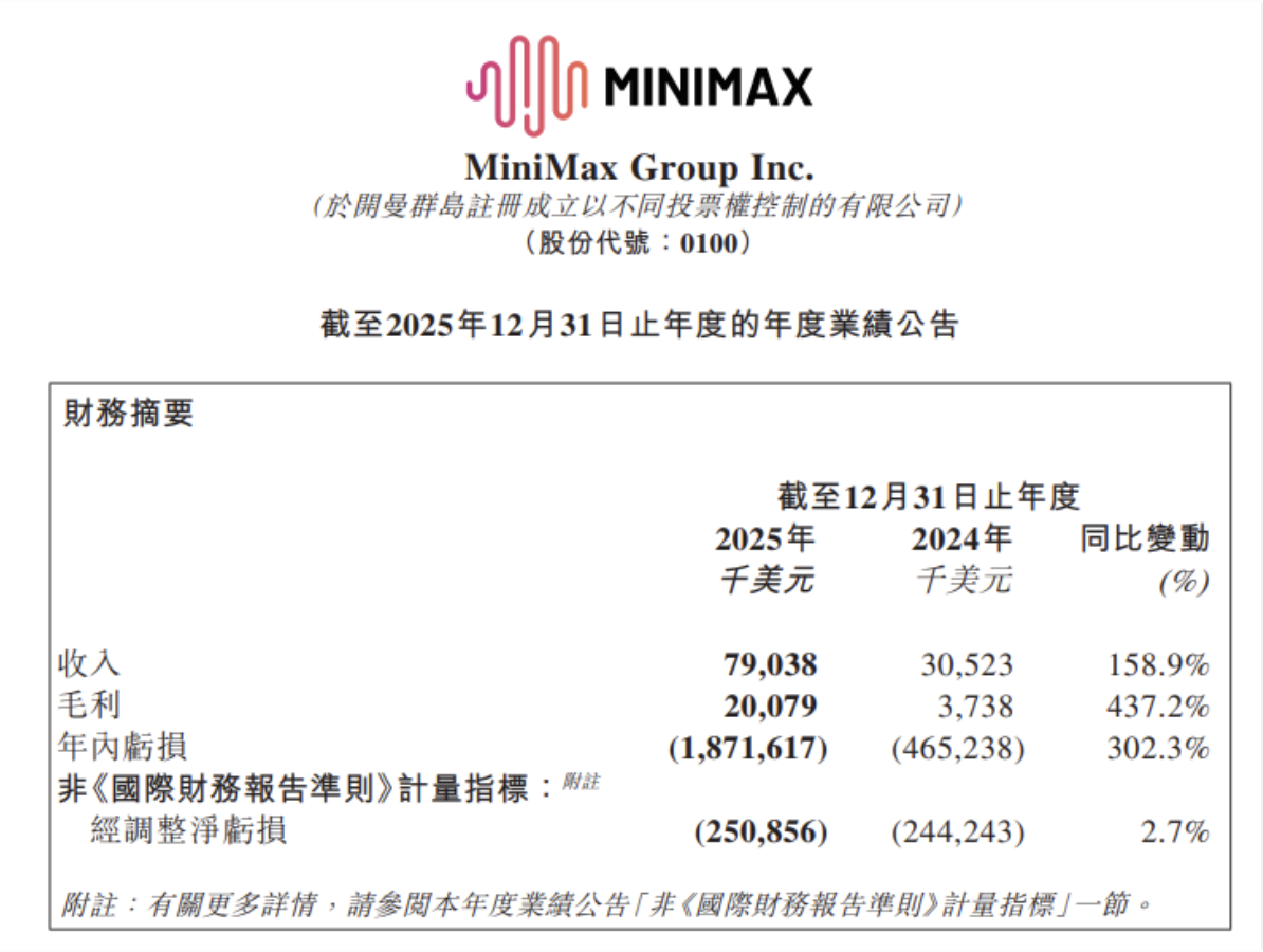 这份财报标志著公司在过去一年中于生成式 AI 领域的技术突破与商业化进程的关键里程碑。这家全球 AI 基础模型公司实现了强劲增长,主要得益于 AI 原生产品和开放平台的快速采用。作为香港资本市场中备受瞩目的 AI 标竿企业,MiniMax 的年度表现将为投资者提供观察全球基础模型产业增长潜力的重要参考。