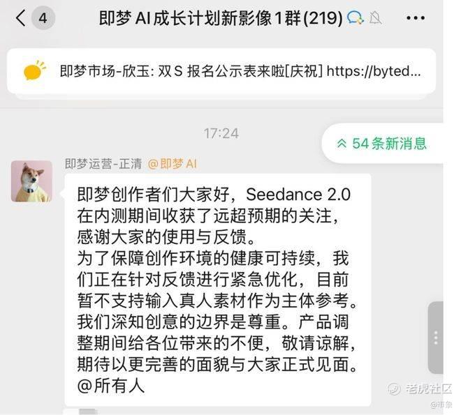 随后字节跳动很快做出反应,即梦创作者社群中,平台运营人员发布通知称,目前暂不支持输入真人素材作为主体参考,并强调“创意的边界是尊重”。