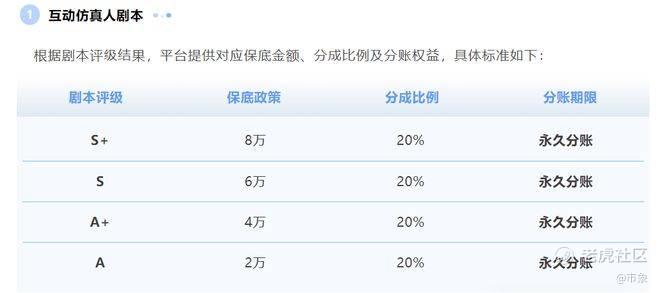 平台的信号很明确。根据抖音集团近期政策,AI仿真人短剧被列为重点扶持方向。红果将仿真人剧本分为S+、S、A+、A四档,分别给予8万、6万、4万、2万元保底,同时统一享有20%的永久分账。