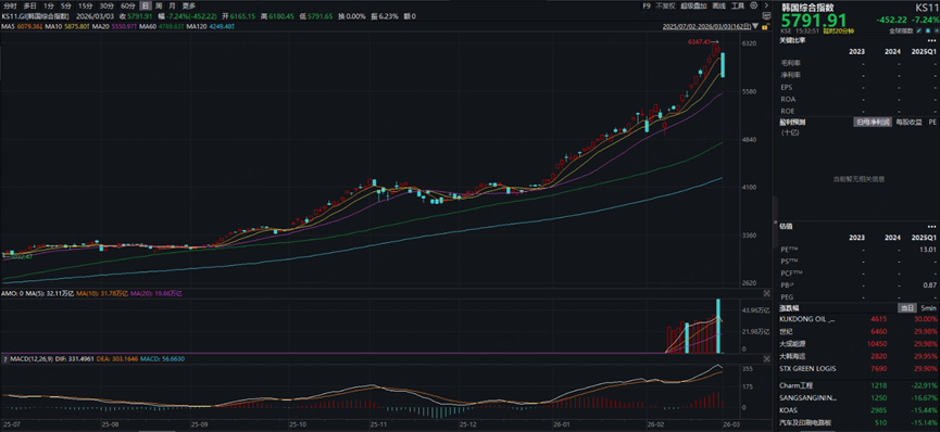 KOSPI指数自2月底高位6300点附近后罕见暴跌,最新报5791点,单日最大跌幅达7%以上,创下2024年8月以来最剧烈调整。此前一路连破历史高位的强势行情,在短时间内出现急刹车。
