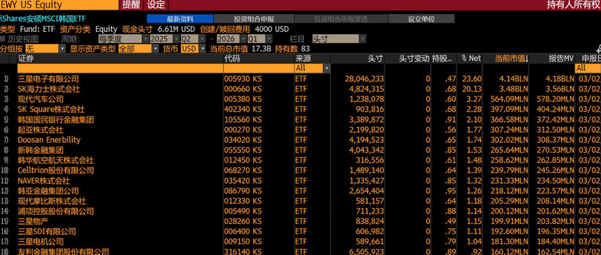 $韩国ETF-iShares MSCI(EWY)$ 规模约179亿美元,管理费0.59%。持仓以韩国最大市值公司为核心,三星电子和SK海力士占比最高: