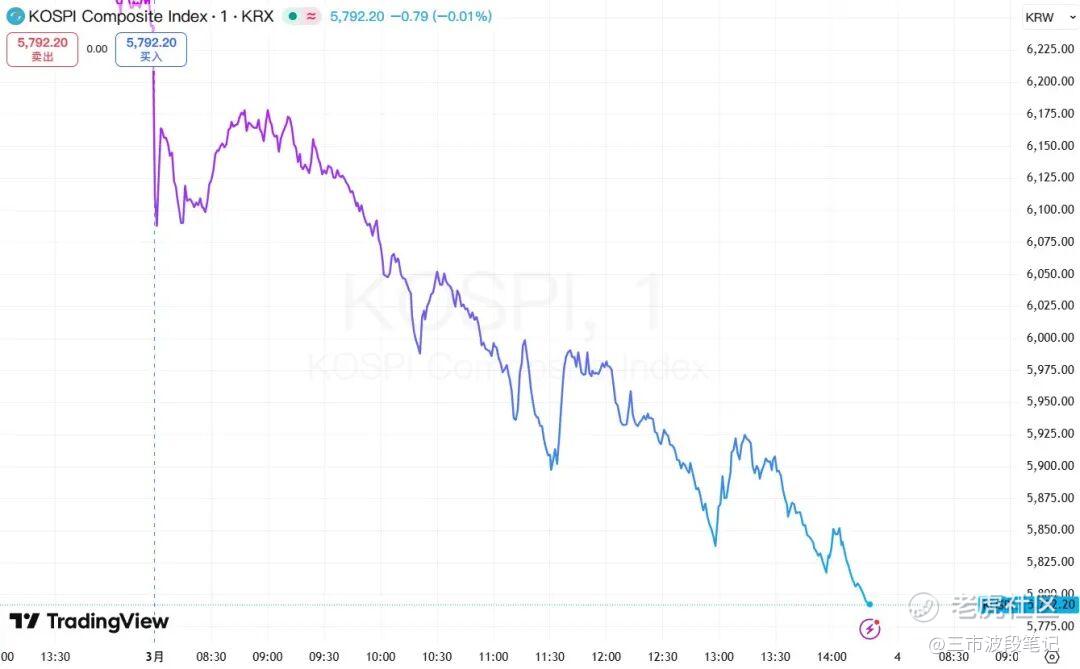 除了大宗商品之外,韩国股市也崩了,韩国KOSPI指数跌幅扩大至7%以上,SK海力士和三星股价跌近10%,国内中韩半导体ETF(513310)今日领跌全ETF市场,最深跌9.7%。
