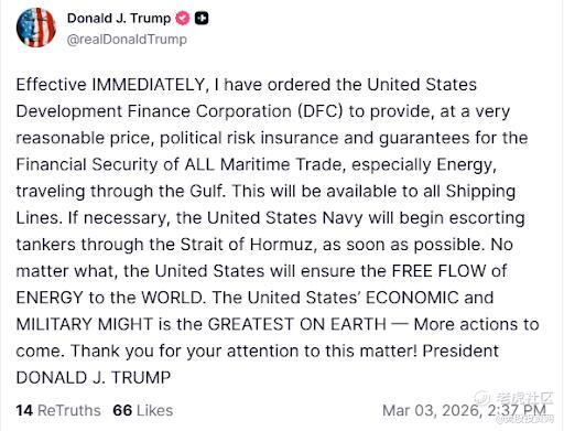 即刻生效,我已命令美国发展金融公司(DFC)以合理价格为所有途经海湾地区的海上贸易。尤其是能源运输提供政治风险保险与金融安全保障。如有必要,美国海军将尽快开始护送油轮穿越霍尔木兹海峡。无论如何,美国将确保能源自由流通至全球。