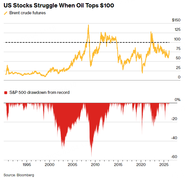那现在还能参考什么?油价。尽管目前石油分析师普遍认为油价不会飙升至每桶100美元,但股市多头正在考虑上行风险-当油价突破100美元时,股市会表现疲软,参考历史数据:自1983年以来,标普500指数在油价高于100美元的时期之后,一年内平均下跌1.6%。(参考油价主要是因为,油价上涨,企业成本上升,通胀反弹,美联储暂停降息或者甚至加息。)