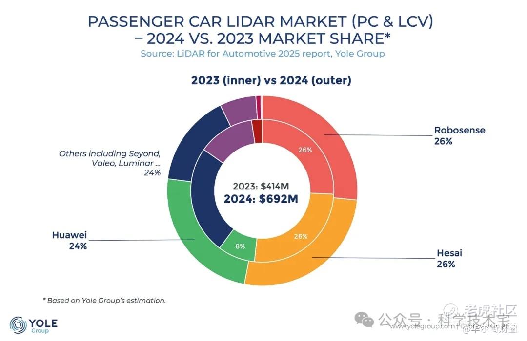 根据Yole Group发布的《2025年全球车载激光雷达市场报告》,2024年全球车载激光雷达市场份额前五名的厂商分别为速腾聚创、禾赛科技、华 为、图通达、法雷奥。