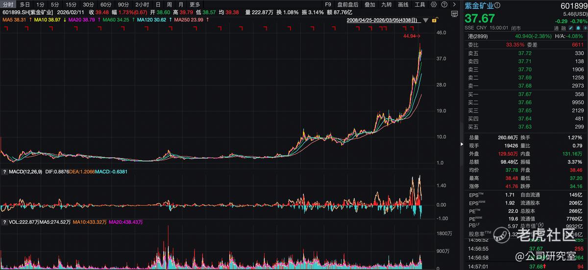 截至3月5日收盘,紫金矿业股价报收37.67元/股,较2020年初的低点涨幅超10倍,市值为10016亿元。