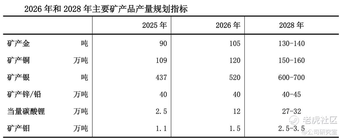 根据紫金矿业发布的2026-2028年三年规划,在2028年黄金产量将达130-140吨,较2025年增幅超30%;铜产量将达150-160万吨,较2025年增幅超35%,剑指全球铜、金产量前三;银产量将达到600—700吨,较2025年增幅超35%;碳酸锂产量将达27-32万吨,较2025年增幅近十倍。