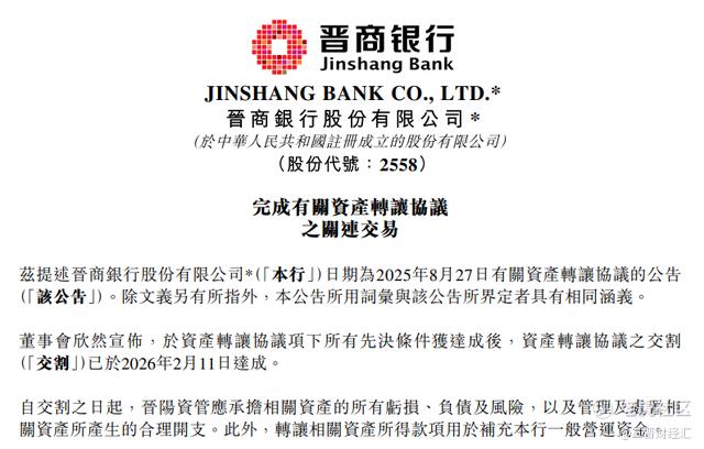 3月4日,港股上市公司晋商银行(2558.HK)公告披露,其与晋阳资产管理股份有限公司(以下简称“晋阳资管”)签署的不良资产转让协议已于2月11日完成交割。
