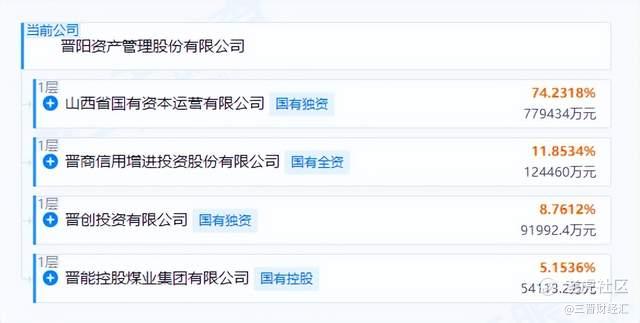 股权结构上,晋阳资管控股股东为山西省国有资本运营有限公司,持股74.23%;晋商信用增进投资股份有限公司、晋创投资有限公司、晋能控股煤业集团有限公司分别持股11.85%、8.76%、5.15%。