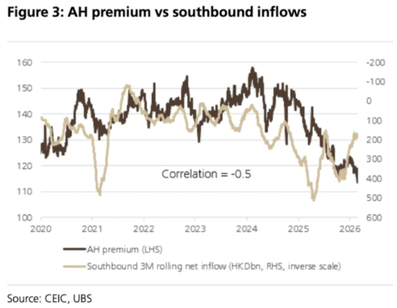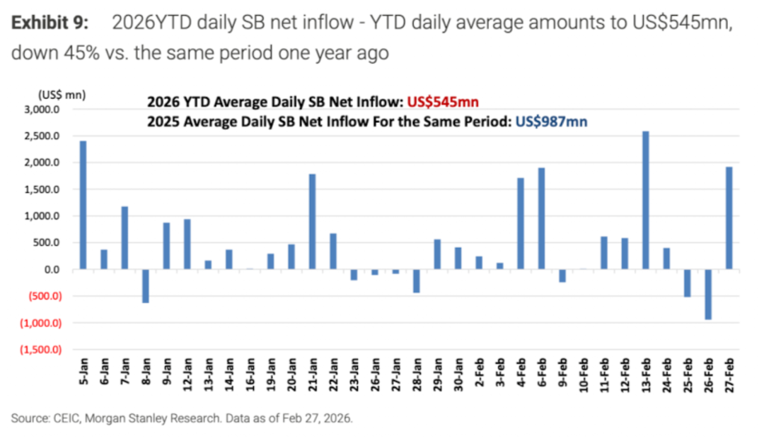 4)南下资金流入明显放缓。2026年迄今,通过南向通道流入港股的日均净额为5.45亿美元,同比下滑45%;