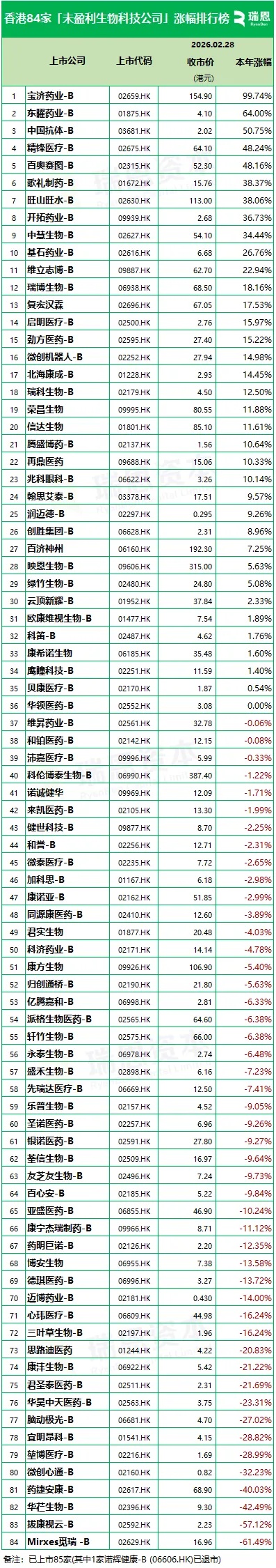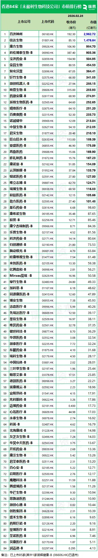 84家香港上市“未盈利生物科技公司”市值排行及股市表现 | 港股.20260228