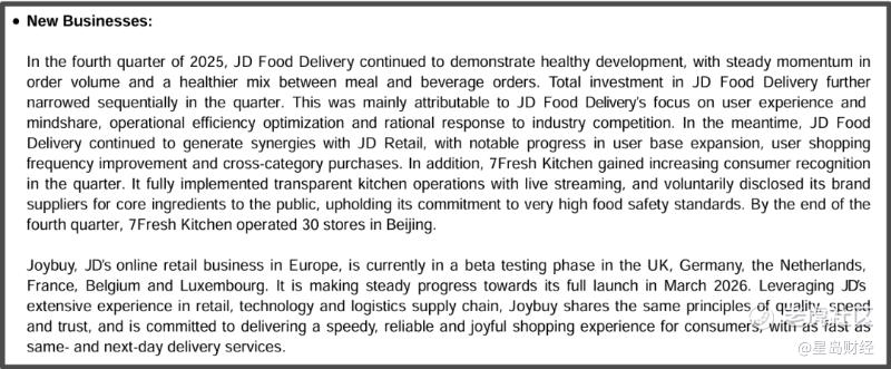 更值得关注的是,新业务亏损已实现逐季收窄,其中外卖业务第四季度总投入规模环比收窄,餐饮订单结构趋于健康,还与京东零售形成用户增长、购频提升、跨品类购买的协同效应。