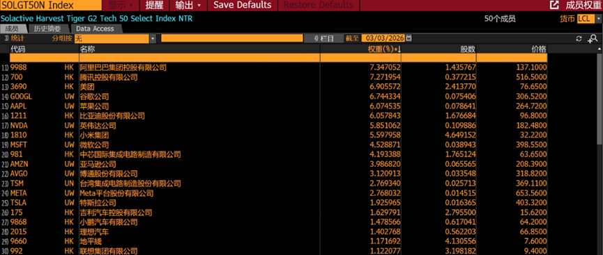 目前来看,Solactive Harvest Tiger G2 Tech 50 Select Index成份股数量为50只,其中,港股为30只,美股为20只,持仓最大的是 $阿里巴巴-W(09988)$ ,占比7.3%;其次是 $腾讯控股(00700)$ ,占比7.3%;前10大成份股中,包括 $谷歌(GOOG)$ 、 $苹果(AAPL)$ 、 $英伟达(NVDA)$ 、 $微软(MSFT)$ 、 $亚马逊(AMZN)$ 等美国科技巨头: