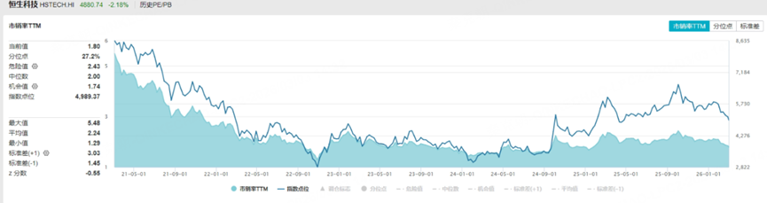 恒生科技指数在经过一轮回调后,市销率估值降至1.8倍,位于5年来较低位置: