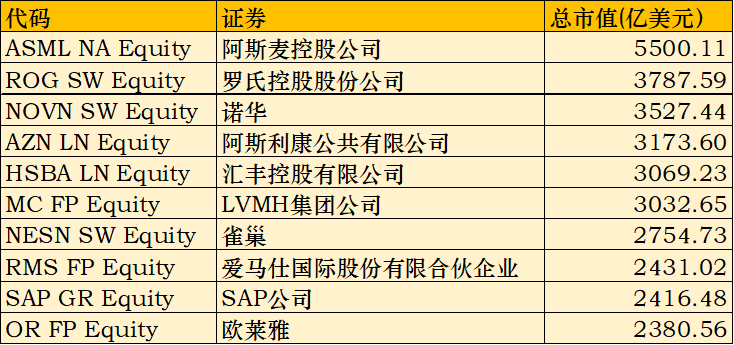 比如欧洲,前10大市值的公司里,与科技相关的只有 $阿斯麦(ASML)$ 和 $SAP SE(SAP)$ 两家,其余公司主要是医药、奢侈品、银行和消费企业: